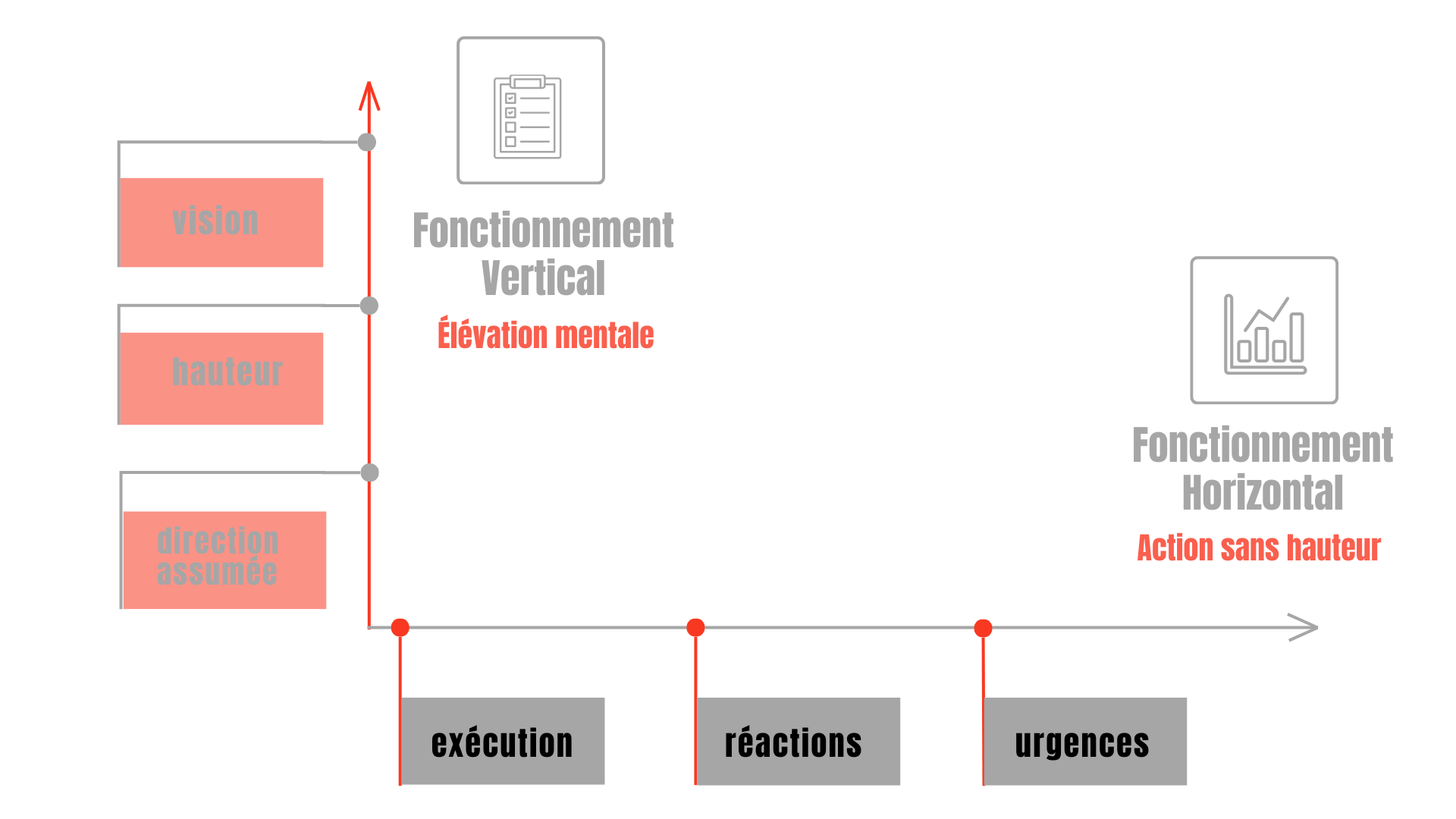 - Horizontal = le mode quotidien, centré sur l’exécution, la réaction, la gestion des urgences. Tu es dans le flux, tu multiplies les actions, mais tu ne prends pas de hauteur. Exemple : tu passes ta journée à répondre à des messages ou ajuster des détails au lieu de clarifier ton cap stratégique.