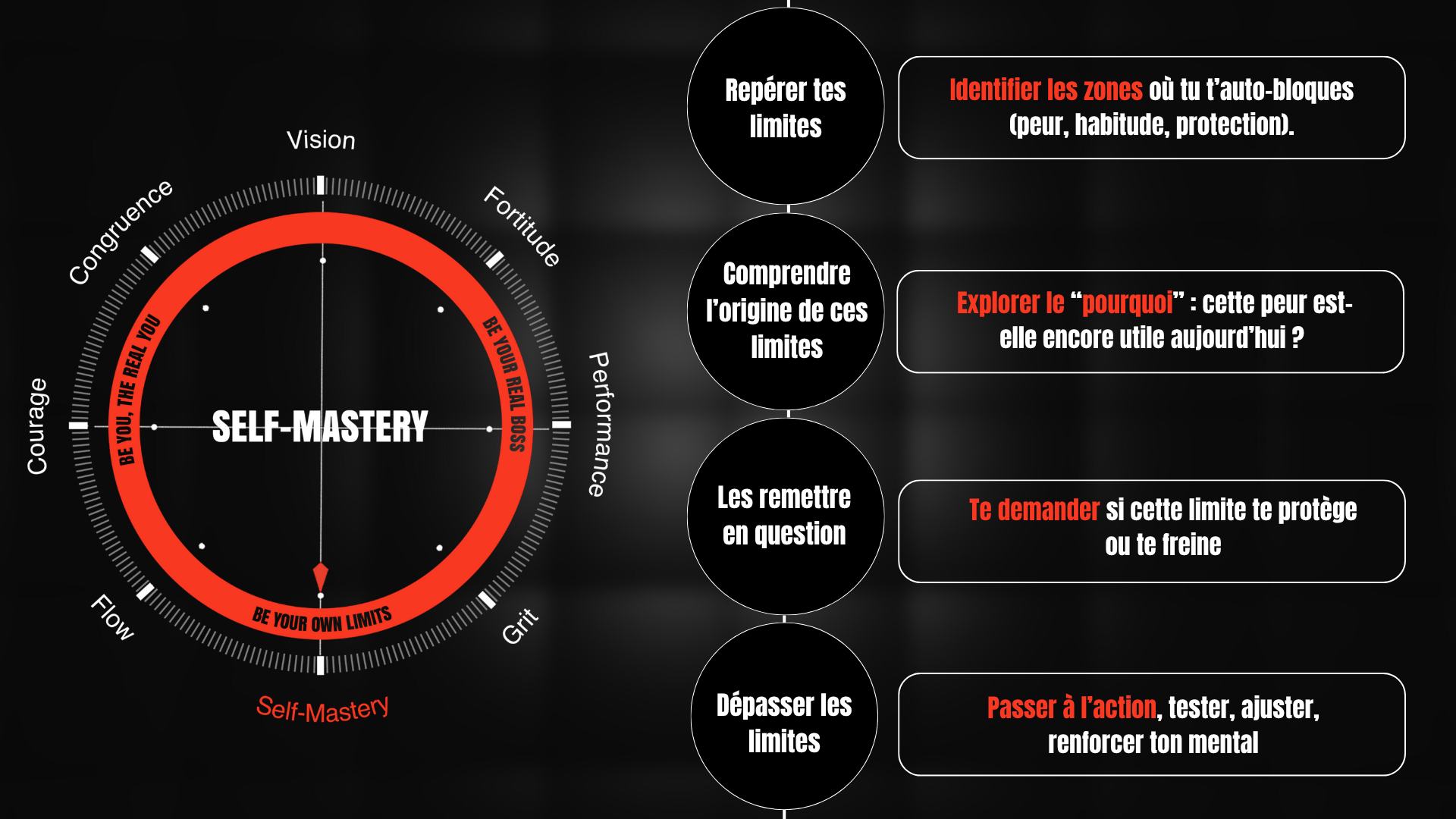 Ta limite, c’est ce que tu considères comme “non-négociable” à l’intérieur de toi — ces points aveugles, ces peurs “raisonnables”, ces règles silencieuses qui structurent ta zone de confort.